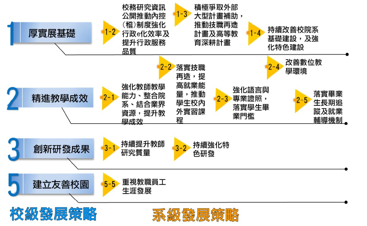 本系目前擬訂之中長期發展策略,包含下列六項: 1、課程規劃-整體規劃企業管理課程、專業類組課程及彈性學程。 2、研究環境-建立富有特色之基礎及應用研究環境,以提昇整體學術研究品質及實 務運用成效。 3、師資延攬-積極延攬學經歷俱優秀人才,以符時代、環境和學生需求。 4、學術合作-強化國內相關大學系務交流,推展國際學術合作。 5、產學合作-推動系所與產業間之擴大參與合作,增進研究與發展。
